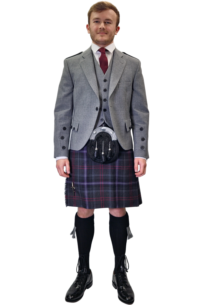 Grey-based tartans are modern, versatile, and effortlessly stylish — perfect for those who want a contemporary take on traditional Highland dress. At Kilts for Hire, we have the largest selection of grey tartans for hire, including our very own Bute Heather Grey Collection, designed to look stunning with charcoal or light grey tweed jackets, as well as the classic black Prince Charlie. From subtle heathers to bold granite tones, our grey tartans suit every style and are a perfect match for both traditional and modern Highland outfits.